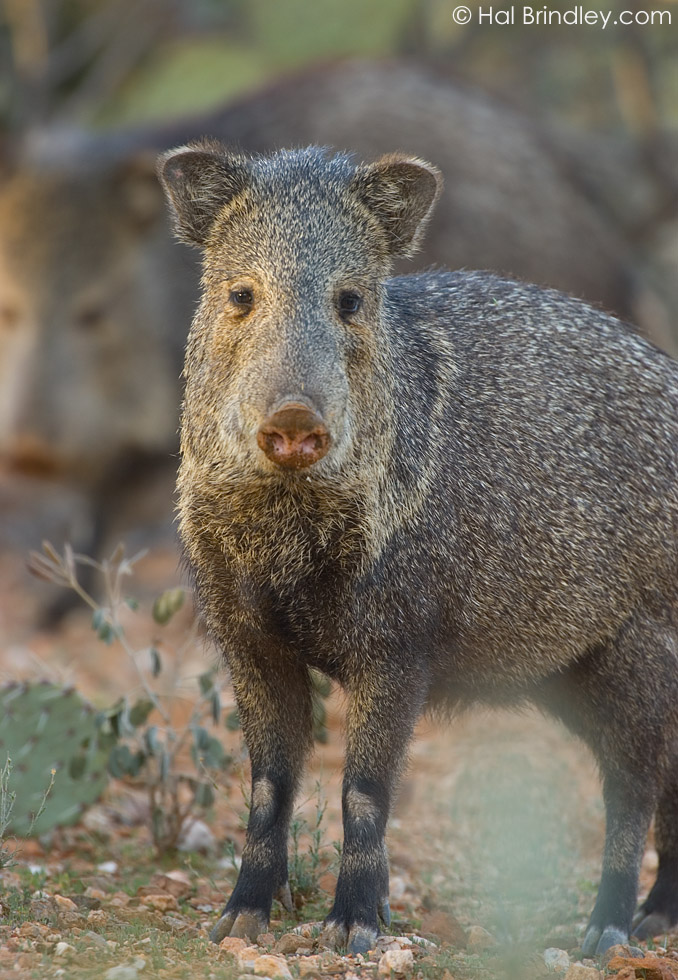 The javelina (most commonly referred to in English as a Collared Peccary) is a pig-like critter found throughout much of Central and South America. However, they have quite a few biological differences from the true old-world pigs (for example: straight tusks, fewer teeth, single dewclaw, 2 compartments in the stomach, and best of all, a strong skunky musk gland on their rump.) These little buddies have a lot of character. They walk around with a very self important strut and haughty attitude. Perhaps the reason they seem so indignant is because they have been cursed with a particularly annoying combination of senses. Their sense of smell is superb and their vision is pitiful. This means they know you’re there, they know you’re very close by, but they can’t for the life of them figure out where. This peccary is pondering the age-old problem “cactus or guy-in-a-green-shirt?”
